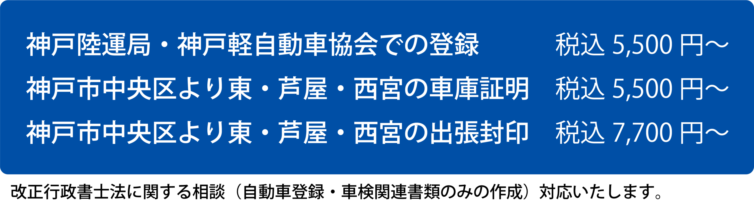 | 行政書士による書類作成(登録書類・車検時書類、改正行政書士法対応) | 2,200円+実費 |